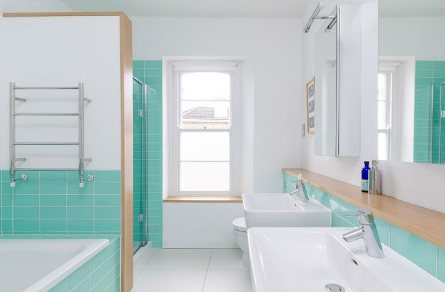 Além de azulejos, turquesa também pode ser aplicado pintando, mais rápido e mais prático, e sobretudo econômico. Uma solução é pintar a base das paredes turquesas e combinar um par de cores (geralmente branco e cinza) para pintar o resto.