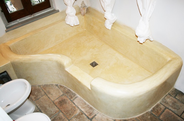 Não se trata de uma banheira de cimento cheio, mas é uma estrutura em porcelana ou outros materiais, como vidro ou acrílico, que é então revestido com cimento Tratado.