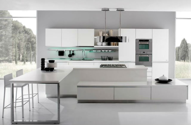 Mesmo as portas dos móveis e as prateleiras serão modernas e essenciais, por isso nós lhe indicamos comprá-los sem puxadores. Para quebrar um pouco o excesso de branco na cozinha, sugerimos algum elemento de mobiliário, mesmo que pequeno, como um serviço de café, uma bandeja ou um conjunto de livros de receitas coloridas.