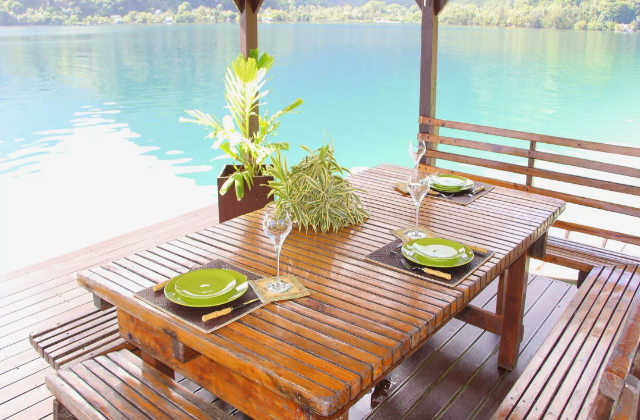 No jardim você pode apreciar a vista sobre uma plataforma de madeira onde também foi colocada uma mesa e cadeiras para jantar ao luar, perto do mar.