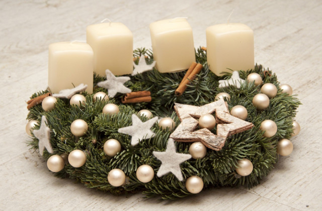 Se você quiser optar por outra cor de Natal que não a vermelha, escolha o ouro. Pegue um pouco de tinta spray e dê a cor dourada em cones de pinheiro ou em ramos de madeira. Você pode encontrá-los facilmente mesmo no jardim. O floco em vez do vermelho, use-o em cetim cor creme. Corte algumas estrelas em feltro e adicione algumas canelas em pau.