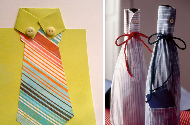 Se você quer dar uma garrafa de um bom vinho, use uma camisa velha para embrulhar o vinho; corte uma manga e costure no fundo, enquanto a parte superior, perto do pulso, será amarrada com uma simpática fita.