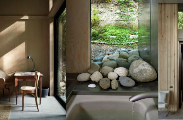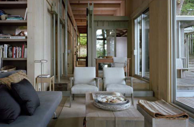 Os ambientes dos chalés são variados, entre os quais notamos um pequeno estúdio, provavelmente onde o arquiteto Jim trabalha no verão. À sombra da natureza, o estúdio é iluminado pela luz solar natural, que entra da enorme parede de vidro. Um belo banho coroa a relação entre a casa e a natureza, de fato, parece uma janela aberta, com uma cascata de pedras pronta para entrar na casa, para representar próprio o contato próximo com a natureza.