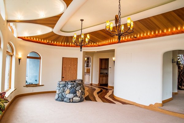 No mesmo andar tem dois banheiros, também em mármore e madeira, que completa a atmosfera mágica da casa. No térreo, a sala de estar tem um lindo piso em parquet e muitos círculos em madeira. Todas as outras decorações, como o lustre se inspiram em motivos florais.