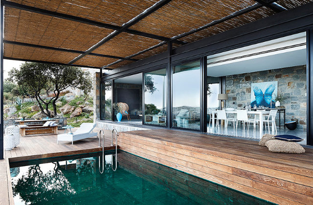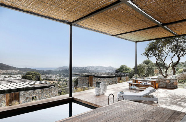 A casa está equipada com um terraço e piscina, que tem um revestimento de bambu bem harmonizado com a cor e a textura da parede interna de pedra que pode ser visto pelas grandes janelas deslizantes de vidro.
