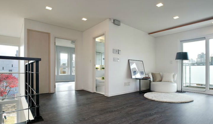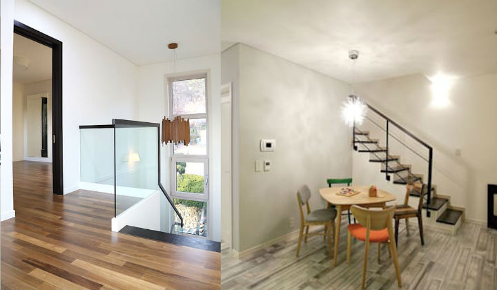 O primeiro andar (foto acima) não é o primeiro andar de uma casa desabitada, mas é deliberadamente minimalista, o que permite as brincadeiras expansivas das crianças, dando-lhes um amplo espaço onde podem correr ou simplesmente criar uma pista para os carros. O piso é laminado. O laminado é fácil de manter e mais seguro do que os azulejos, portanto, adequado para crianças e seus carrinhos.