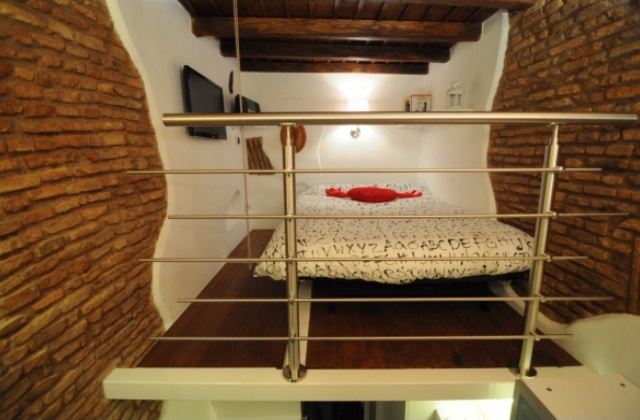 A altura do teto, típico dos antigos locais nesta área de Roma, tem permitiu a expansão interna da habitação, com o objetivo de desenvolver verticalmente. É suficiente uma escada de 10 degraus para alcançar sobre uma espaçosa cama.