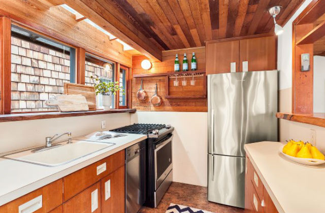Embora completamente em madeira, a casa ainda apresenta um estilo puramente moderno. De fato, na cozinha (foto acima) notamos um design plano e contínuo para o mobiliário que continua para aparelhos como o forno ou a máquina de lavar louça.