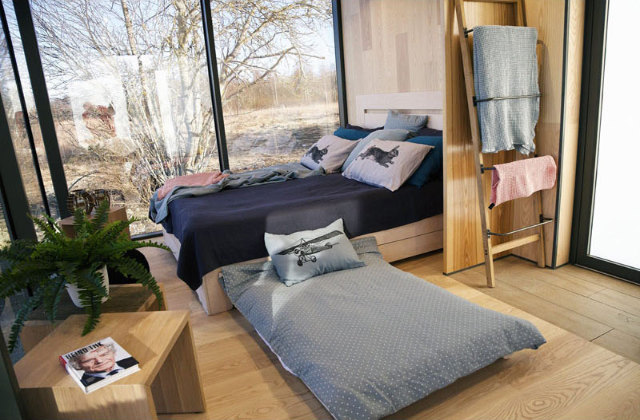 O maior tem uma cama de casal e está completamente rodeado por paredes transparentes, o que, obviamente, ao externo, garante a privacidade. Há outro quarto com duas camas dobráveis para dois convidados ou para crianças.