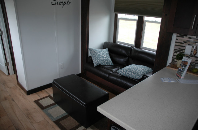 As mesas que são usadas são em sistema de ilha e sobem desaparecendo dentro das paredes. Na sala de estar tem também um sofá cama, com móveis de madeira polida que servem como armário. A estrutura pode acomodar mais do que duas pessoas.