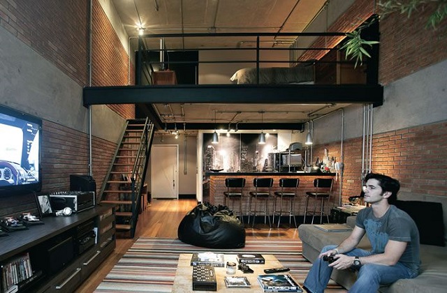 Ou mobiliários grandes a vista. E, então, inserir alguns detalhes especiais, como um revestimento falso de parede, que simulam tijolos. Podemos referir-se a originaria destinação do local.