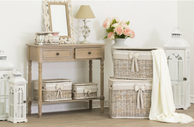Por exemplo, você só pode criar uma entrada no estilo shabby, colocando um aparador com um espelho. Normalmente, esse tipo de mobiliário tem prateleira baixa. Aqui você pode colocar uma linda cesta de vime decorada com renda.