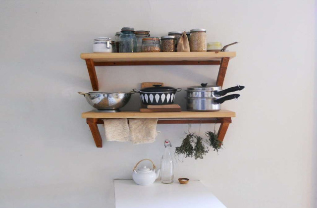 Na prateleira, você pode colocar potes, pratos ou frascos para colocar café, açúcar, farinha, mas também macarrão e legumes. E por que não? Abaixo, você também pode colocar simpáticos potes com as ervas agradáveis, para suas suculentas receitas.