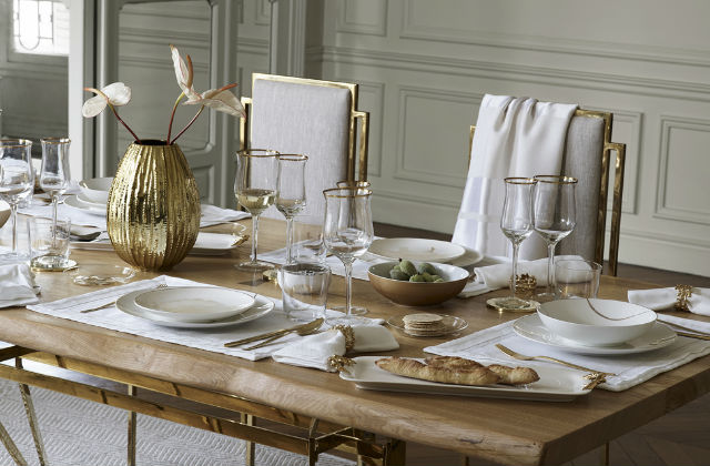 Ou, como observamos na figura abaixo, há um excelente retorno ao classicismo, com o estilo shabby chique, cujos elementos estão inteiramente rodeados de ouro. Neste caso, observamos cadeiras, vasos, pratos, a própria mesa e praticamente qualquer elemento presente no ambiente. Certamente, devemos dizer que a única coisa que não falta neste catálogo Zara 2018 é refinamento, bem como gosto e elegância.